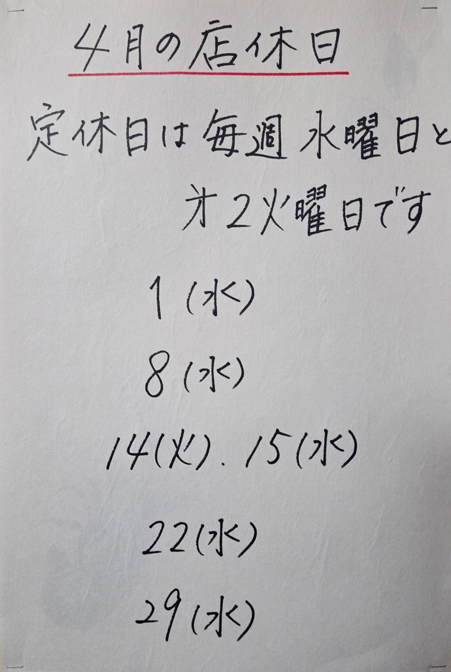 • 4月の定休日のお知らせ